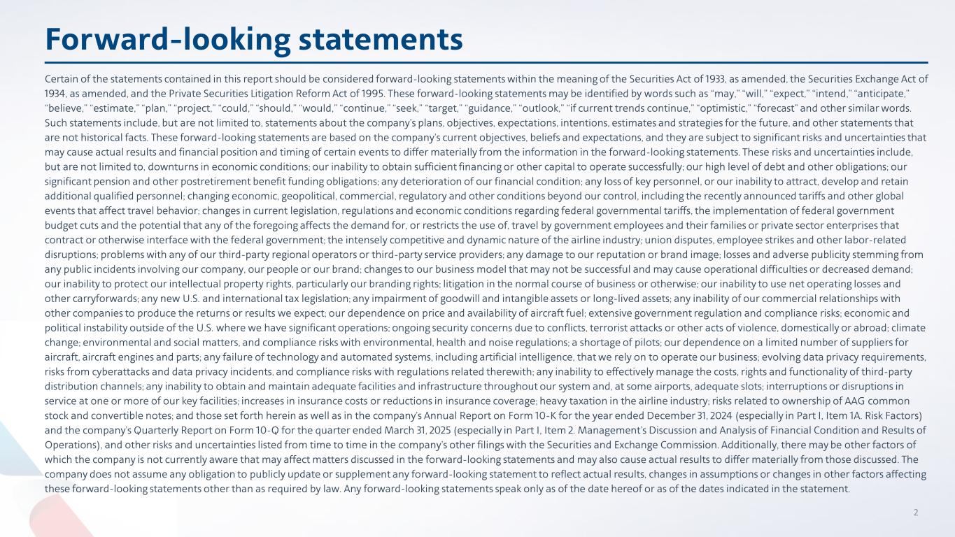 Certain of the statements contained in this report should be considered forward-looking statements within the meaning of the Securities Act of 1933, as amended, the Securities Exchange Act of 1934, as amended, and the Private Securities Litigation Reform Act of 1995. These forward-looking statements may be identified by words such as “may,” “will,” “expect,” “intend,” “anticipate,” “believe,” “estimate,” “plan,” “project,” “could,” “should,” “would,” “continue,” “seek,” “target,” “guidance,” “outlook,” “if current trends continue,” “optimistic,” “forecast” and other similar words. Such statements include, but are not limited to, statements about the company’s plans, objectives, expectations, intentions, estimates and strategies for the future, and other statements that are not historical facts. These forward-looking statements are based on the company’s current objectives, beliefs and expectations, and they are subject to significant risks and uncertainties that may cause actual results and financial position and timing of certain events to differ materially from the information in the forward-looking statements. These risks and uncertainties include, but are not limited to, downturns in economic conditions; our inability to obtain sufficient financing or other capital to operate successfully; our high level of debt and other obligations; our significant pension and other postretirement benefit funding obligations; any deterioration of our financial condition; any loss of key personnel, or our inability to attract, develop and retain additional qualified personnel; changing economic, geopolitical, commercial, regulatory and other conditions beyond our control, including the recently announced tariffs and other global events that affect travel behavior; changes in current legislation, regulations and economic conditions regarding federal governmental tariffs, the implementation of federal government budget cuts and the potential that any of the foregoing affects the demand for, or restricts the use of, travel by government employees and their families or private sector enterprises that contract or otherwise interface with the federal government; the intensely competitive and dynamic nature of the airline industry; union disputes, employee strikes and other labor-related disruptions; problems with any of our third-party regional operators or third-party service providers; any damage to our reputation or brand image; losses and adverse publicity stemming from any public incidents involving our company, our people or our brand; changes to our business model that may not be successful and may cause operational difficulties or decreased demand; our inability to protect our intellectual property rights, particularly our branding rights; litigation in the normal course of business or otherwise; our inability to use net operating losses and other carryforwards; any new U.S. and international tax legislation; any impairment of goodwill and intangible assets or long-lived assets; any inability of our commercial relationships with other companies to produce the returns or results we expect; our dependence on price and availability of aircraft fuel; extensive government regulation and compliance risks; economic and political instability outside of the U.S. where we have significant operations; ongoing security concerns due to conflicts, terrorist attacks or other acts of violence, domestically or abroad; climate change; environmental and social matters, and compliance risks with environmental, health and noise regulations; a shortage of pilots; our dependence on a limited number of suppliers for aircraft, aircraft engines and parts; any failure of technology and automated systems, including artificial intelligence, that we rely on to operate our business; evolving data privacy requirements, risks from cyberattacks and data privacy incidents, and compliance risks with regulations related therewith; any inability to effectively manage the costs, rights and functionality of third-party distribution channels; any inability to obtain and maintain adequate facilities and infrastructure throughout our system and, at some airports, adequate slots; interruptions or disruptions in service at one or more of our key facilities; increases in insurance costs or reductions in insurance coverage; heavy taxation in the airline industry; risks related to ownership of AAG common stock and convertible notes; and those set forth herein as well as in the company’s Annual Report on Form 10-K for the year ended December 31, 2024 (especially in Part I, Item 1A. Risk Factors) and the company’s Quarterly Report on Form 10-Q for the quarter ended March 31, 2025 (especially in Part I, Item 2. Management’s Discussion and Analysis of Financial Condition and Results of Operations), and other risks and uncertainties listed from time to time in the company’s other filings with the Securities and Exchange Commission. Additionally, there may be other factors of which the company is not currently aware that may affect matters discussed in the forward-looking statements and may also cause actual results to differ materially from those discussed. The company does not assume any obligation to publicly update or supplement any forward-looking statement to reflect actual results, changes in assumptions or changes in other factors affecting these forward-looking statements other than as required by law. Any forward-looking statements speak only as of the date hereof or as of the dates indicated in the statement. Forward-looking statements 2