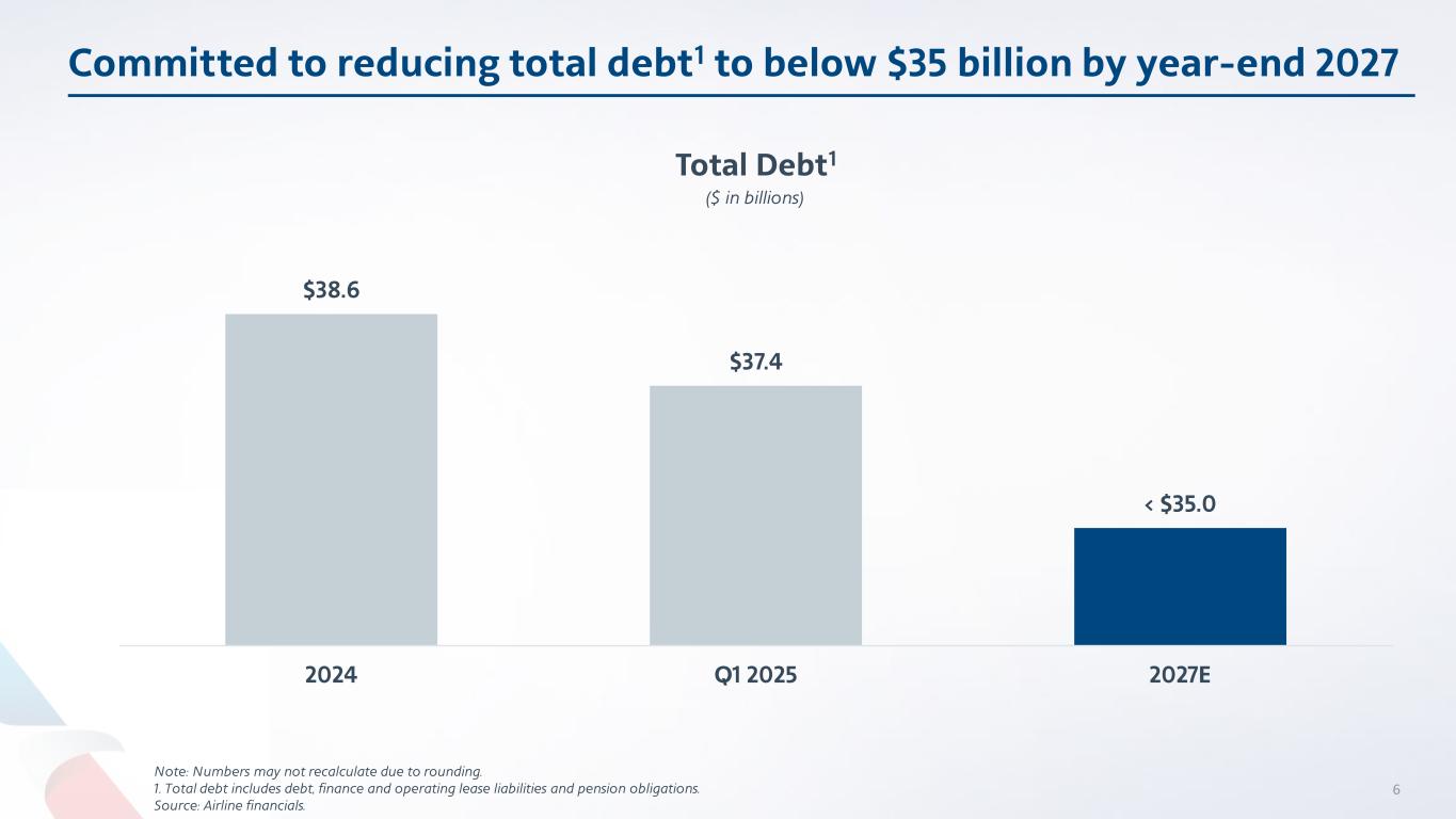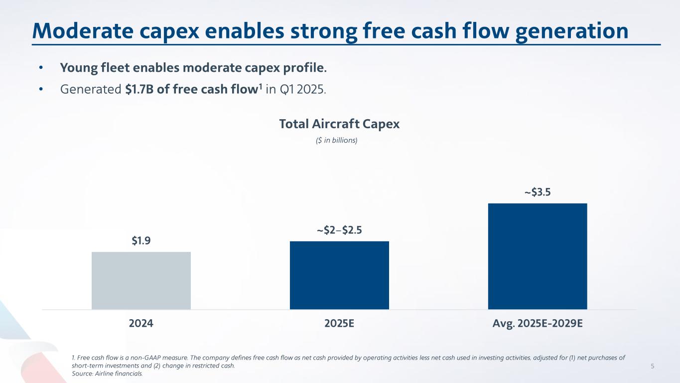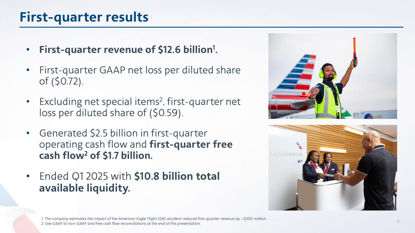 First-quarter results • First-quarter revenue of $12.6 billion1. • First-quarter GAAP net loss per diluted share of ($0.72). • Excluding net special items2, first-quarter net loss per diluted share of ($0.59). • Generated $2.5 billion in first-quarter operating cash flow and first-quarter free cash flow2 of $1.7 billion. • Ended Q1 2025 with $10.8 billion total available liquidity. 1. The company estimates the impact of the American Eagle Flight 5342 accident reduced first-quarter revenue by ~$200 million. 2. See GAAP to non-GAAP and free cash flow reconciliations at the end of this presentation. 3