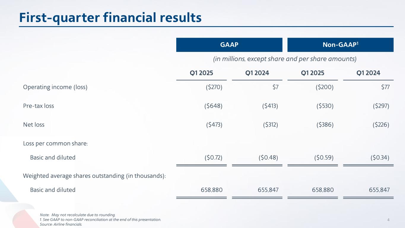 First-quarter financial results Note: May not recalculate due to rounding. 1. See GAAP to non-GAAP reconciliation at the end of this presentation. Source: Airline financials. GAAP Non-GAAP1 (in millions, except share and per share amounts) Q1 2025 Q1 2024 Q1 2025 Q1 2024 Operating income (loss) ($270) $7 ($200) $77 Pre-tax loss ($648) ($413) ($530) ($297) Net loss ($473) ($312) ($386) ($226) Loss per common share: Basic and diluted ($0.72) ($0.48) ($0.59) ($0.34) Weighted average shares outstanding (in thousands): Basic and diluted 658,880 655,847 658,880 655,847 4