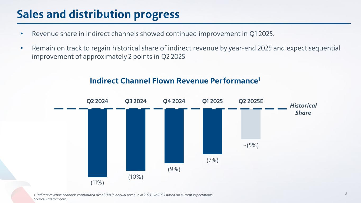 American produced first-quarter revenue of $12.6 billion. Total unit revenue was up 0.7% versus the first-quarter of 2024, driven by continued strength in international unit revenue, which was up 2.9% year over year on 0.8% lower capacity year over year, and continued growth in premium and loyalty revenue. Throughout the quarter, American continued to restore revenue in indirect channels and remains on track to restore its revenue share from indirect channels to historical levels exiting the year. These efforts were offset by a number of factors, including economic uncertainty that pressured domestic leisure demand and the tragic accident of American Eagle Flight 5342.