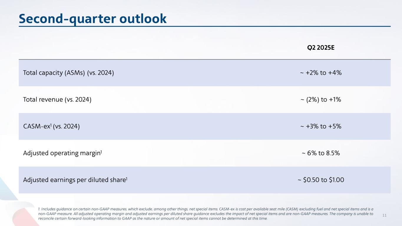 | ● | Capacity - The company expects its second-quarter capacity to be up approximately 2.0% to 4.0% versus the second quarter of 2024. |