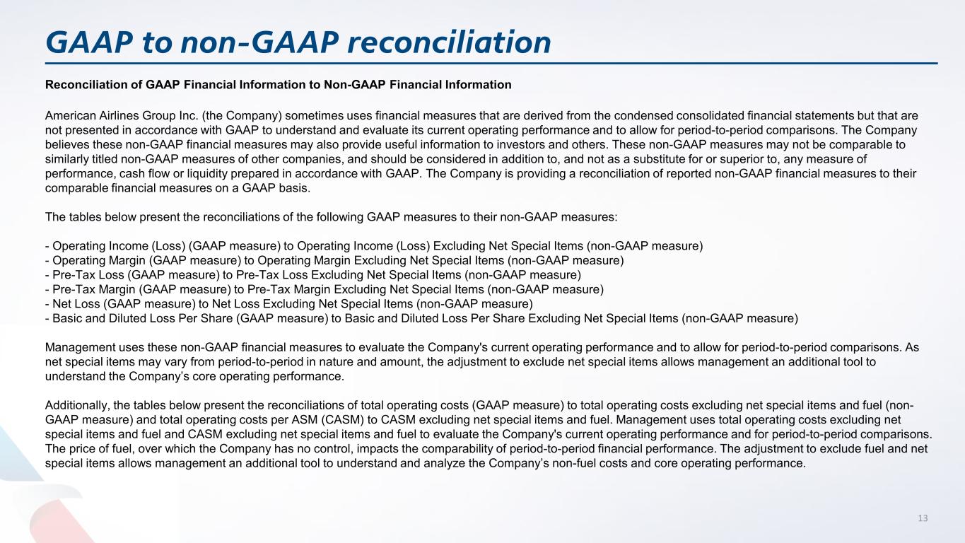 GAAP to non-GAAP reconciliation Reconciliation of GAAP Financial Information to Non-GAAP Financial Information American Airlines Group Inc. (the Company) sometimes uses financial measures that are derived from the condensed consolidated financial statements but that are not presented in accordance with GAAP to understand and evaluate its current operating performance and to allow for period-to-period comparisons. The Company believes these non-GAAP financial measures may also provide useful information to investors and others. These non-GAAP measures may not be comparable to similarly titled non-GAAP measures of other companies, and should be considered in addition to, and not as a substitute for or superior to, any measure of performance, cash flow or liquidity prepared in accordance with GAAP. The Company is providing a reconciliation of reported non-GAAP financial measures to their comparable financial measures on a GAAP basis. The tables below present the reconciliations of the following GAAP measures to their non-GAAP measures: - Operating Income (Loss) (GAAP measure) to Operating Income (Loss) Excluding Net Special Items (non-GAAP measure) - Operating Margin (GAAP measure) to Operating Margin Excluding Net Special Items (non-GAAP measure) - Pre-Tax Loss (GAAP measure) to Pre-Tax Loss Excluding Net Special Items (non-GAAP measure) - Pre-Tax Margin (GAAP measure) to Pre-Tax Margin Excluding Net Special Items (non-GAAP measure) - Net Loss (GAAP measure) to Net Loss Excluding Net Special Items (non-GAAP measure) - Basic and Diluted Loss Per Share (GAAP measure) to Basic and Diluted Loss Per Share Excluding Net Special Items (non-GAAP measure) Management uses these non-GAAP financial measures to evaluate the Company's current operating performance and to allow for period-to-period comparisons. As net special items may vary from period-to-period in nature and amount, the adjustment to exclude net special items allows management an additional tool to understand the Company’s core operating performance. Additionally, the tables below present the reconciliations of total operating costs (GAAP measure) to total operating costs excluding net special items and fuel (non- GAAP measure) and total operating costs per ASM (CASM) to CASM excluding net special items and fuel. Management uses total operating costs excluding net special items and fuel and CASM excluding net special items and fuel to evaluate the Company's current operating performance and for period-to-period comparisons. The price of fuel, over which the Company has no control, impacts the comparability of period-to-period financial performance. The adjustment to exclude fuel and net special items allows management an additional tool to understand and analyze the Company’s non-fuel costs and core operating performance. 13