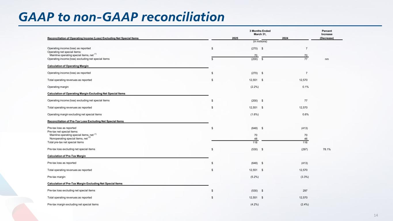 GAAP to non-GAAP reconciliation Reconciliation of Operating Income (Loss) Excluding Net Special Items 3 Months Ended March 31, Percent Increase 2025 2024 (Decrease) (in millions) Operating income (loss) as reported $ (270) $ 7 Operating net special items: Mainline operating special items, net (1) 70 70 Operating income (loss) excluding net special items $ (200) $ 77 nm Calculation of Operating Margin Operating income (loss) as reported $ (270) $ 7 Total operating revenues as reported $ 12,551 $ 12,570 Operating margin (2.2%) 0.1% Calculation of Operating Margin Excluding Net Special Items Operating income (loss) excluding net special items $ (200) $ 77 Total operating revenues as reported $ 12,551 $ 12,570 Operating margin excluding net special items (1.6%) 0.6% Reconciliation of Pre-Tax Loss Excluding Net Special Items Pre-tax loss as reported $ (648) $ (413) Pre-tax net special items: Mainline operating special items, net (1) 70 70 Nonoperating special items, net (2) 48 46 Total pre-tax net special items 118 116 Pre-tax loss excluding net special items $ (530) $ (297) 78.1% Calculation of Pre-Tax Margin Pre-tax loss as reported $ (648) $ (413) Total operating revenues as reported $ 12,551 $ 12,570 Pre-tax margin (5.2%) (3.3%) Calculation of Pre-Tax Margin Excluding Net Special Items Pre-tax loss excluding net special items $ (530) $ 297 Total operating revenues as reported $ 12,551 $ 12,570 Pre-tax margin excluding net special items (4.2%) (2.4%) 14