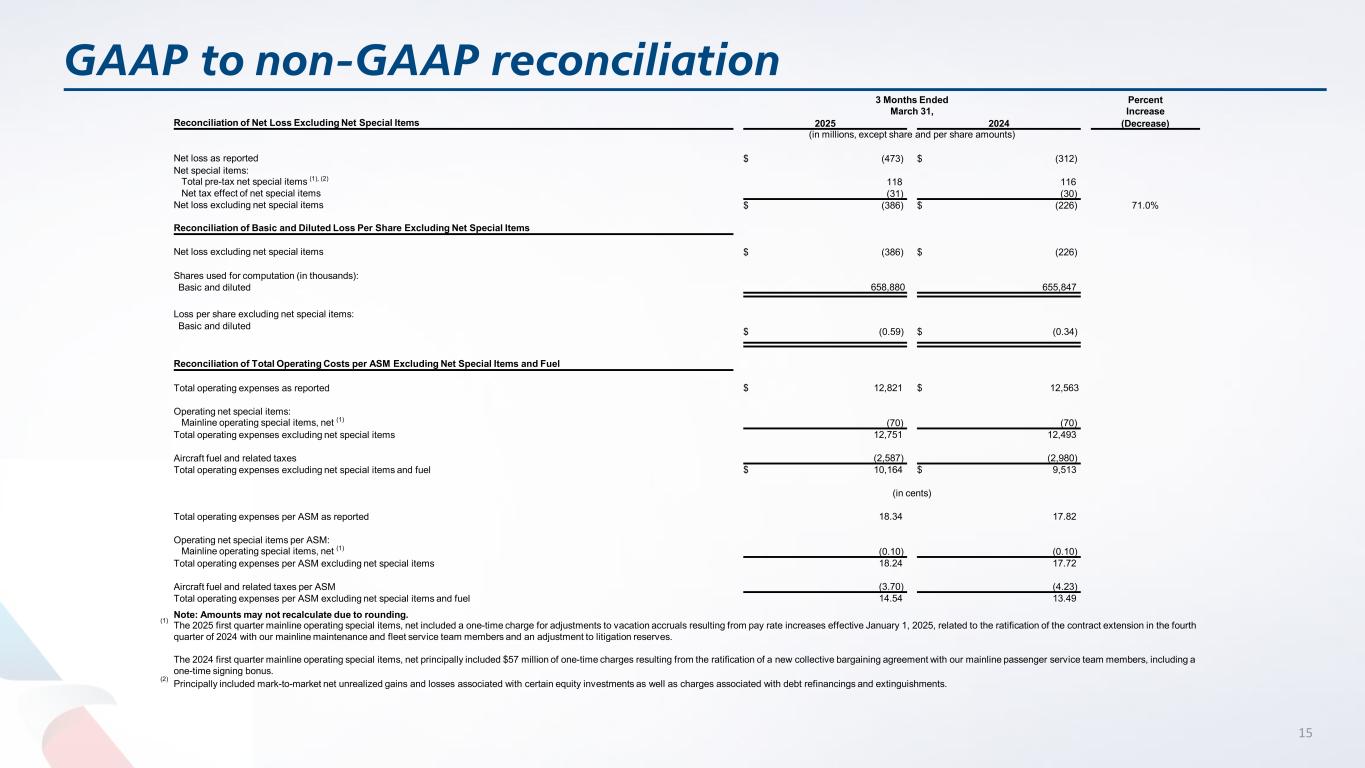 GAAP to non-GAAP reconciliation 3 Months Ended March 31, Percent Increase Reconciliation of Net Loss Excluding Net Special Items 2025 2024 (Decrease) (in millions, except share and per share amounts) Net loss as reported $ (473) $ (312) Net special items: Total pre-tax net special items (1), (2) 118 116 Net tax effect of net special items (31) (30) Net loss excluding net special items $ (386) $ (226) 71.0% Reconciliation of Basic and Diluted Loss Per Share Excluding Net Special Items Net loss excluding net special items $ (386) $ (226) Shares used for computation (in thousands): Basic and diluted 658,880 655,847 Loss per share excluding net special items: Basic and diluted $ (0.59) $ (0.34) Reconciliation of Total Operating Costs per ASM Excluding Net Special Items and Fuel Total operating expenses as reported $ 12,821 $ 12,563 Operating net special items: Mainline operating special items, net (1) (70) (70) Total operating expenses excluding net special items 12,751 12,493 Aircraft fuel and related taxes (2,587) (2,980) Total operating expenses excluding net special items and fuel $ 10,164 $ 9,513 (in cents) Total operating expenses per ASM as reported 18.34 17.82 Operating net special items per ASM: Mainline operating special items, net (1) (0.10) (0.10) Total operating expenses per ASM excluding net special items 18.24 17.72 Aircraft fuel and related taxes per ASM (3.70) (4.23) Total operating expenses per ASM excluding net special items and fuel 14.54 13.49 Note: Amounts may not recalculate due to rounding. (1) The 2025 first quarter mainline operating special items, net included a one-time charge for adjustments to vacation accruals resulting from pay rate increases effective January 1, 2025, related to the ratification of the contract extension in the fourth quarter of 2024 with our mainline maintenance and fleet service team members and an adjustment to litigation reserves. The 2024 first quarter mainline operating special items, net principally included $57 million of one-time charges resulting from the ratification of a new collective bargaining agreement with our mainline passenger service team members, including a one-time signing bonus. (2) Principally included mark-to-market net unrealized gains and losses associated with certain equity investments as well as charges associated with debt refinancings and extinguishments. 15