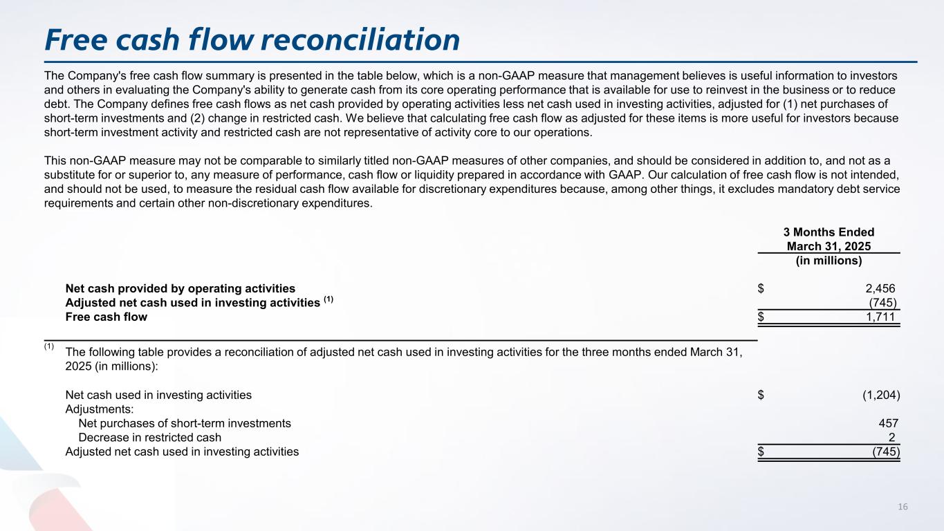 Free cash flow reconciliation The Company's free cash flow summary is presented in the table below, which is a non-GAAP measure that management believes is useful information to investors and others in evaluating the Company's ability to generate cash from its core operating performance that is available for use to reinvest in the business or to reduce debt. The Company defines free cash flows as net cash provided by operating activities less net cash used in investing activities, adjusted for (1) net purchases of short-term investments and (2) change in restricted cash. We believe that calculating free cash flow as adjusted for these items is more useful for investors because short-term investment activity and restricted cash are not representative of activity core to our operations. This non-GAAP measure may not be comparable to similarly titled non-GAAP measures of other companies, and should be considered in addition to, and not as a substitute for or superior to, any measure of performance, cash flow or liquidity prepared in accordance with GAAP. Our calculation of free cash flow is not intended, and should not be used, to measure the residual cash flow available for discretionary expenditures because, among other things, it excludes mandatory debt service requirements and certain other non-discretionary expenditures. 3 Months Ended March 31, 2025 (in millions) Net cash provided by operating activities $ 2,456 Adjusted net cash used in investing activities (1) (745) Free cash flow $ 1,711 (1) The following table provides a reconciliation of adjusted net cash used in investing activities for the three months ended March 31, 2025 (in millions): Net cash used in investing activities $ (1,204) Adjustments: Net purchases of short-term investments 457 Decrease in restricted cash 2 Adjusted net cash used in investing activities $ (745) 16