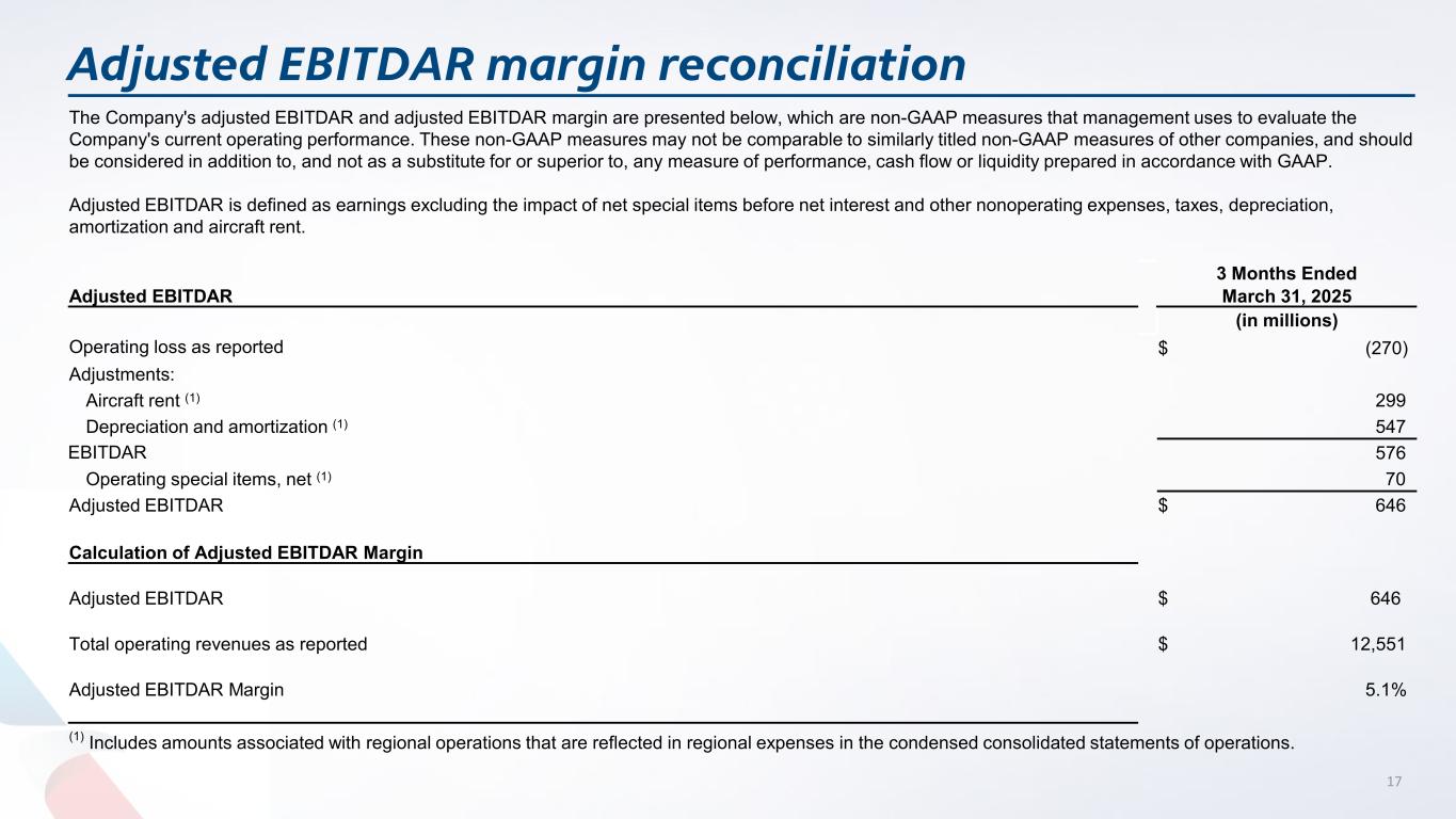 Adjusted EBITDAR margin reconciliation The Company's adjusted EBITDAR and adjusted EBITDAR margin are presented below, which are non-GAAP measures that management uses to evaluate the Company's current operating performance. These non-GAAP measures may not be comparable to similarly titled non-GAAP measures of other companies, and should be considered in addition to, and not as a substitute for or superior to, any measure of performance, cash flow or liquidity prepared in accordance with GAAP. Adjusted EBITDAR is defined as earnings excluding the impact of net special items before net interest and other nonoperating expenses, taxes, depreciation, amortization and aircraft rent. 3 Months Ended Adjusted EBITDAR March 31, 2025 (in millions) Operating loss as reported $ (270) Adjustments: Aircraft rent (1) 299 Depreciation and amortization (1) 547 EBITDAR 576 Operating special items, net (1) 70 Adjusted EBITDAR $ 646 Calculation of Adjusted EBITDAR Margin Adjusted EBITDAR $ 646 Total operating revenues as reported $ 12,551 Adjusted EBITDAR Margin 5.1% (1) Includes amounts associated with regional operations that are reflected in regional expenses in the condensed consolidated statements of operations. 17