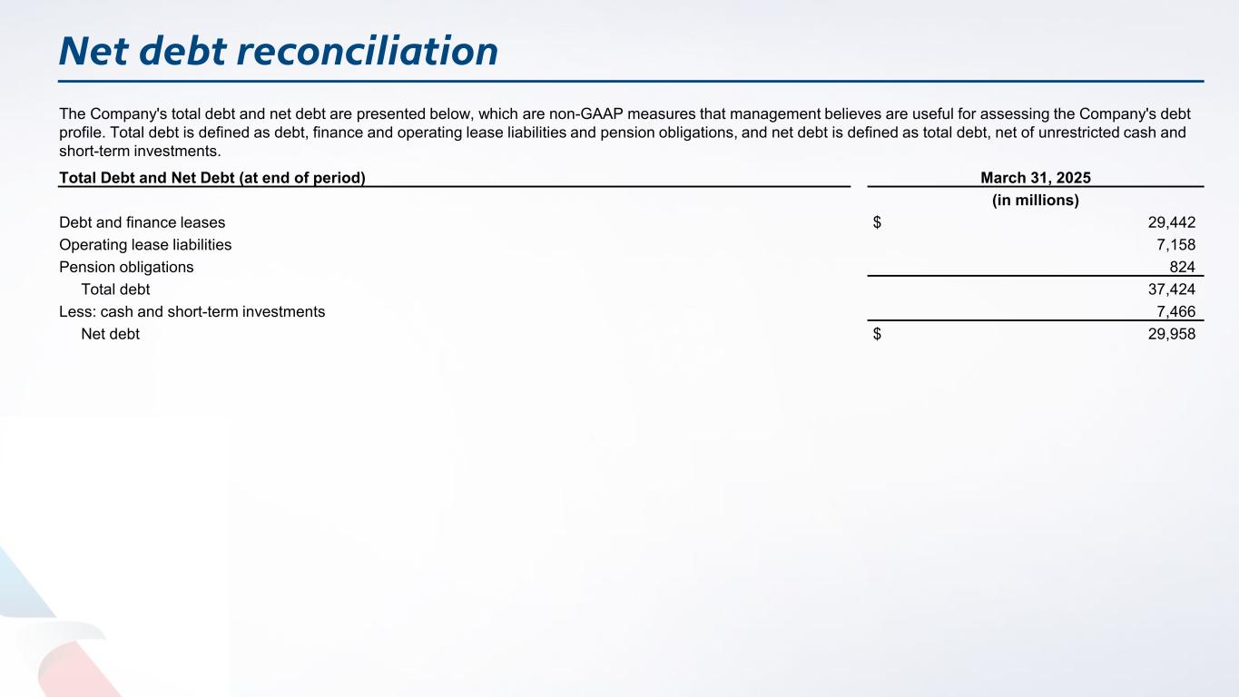 Net debt reconciliation The Company's total debt and net debt are presented below, which are non-GAAP measures that management believes are useful for assessing the Company's debt profile. Total debt is defined as debt, finance and operating lease liabilities and pension obligations, and net debt is defined as total debt, net of unrestricted cash and short-term investments. Total Debt and Net Debt (at end of period) March 31, 2025 (in millions) Debt and finance leases $ 29,442 Operating lease liabilities 7,158 Pension obligations 824 Total debt 37,424 Less: cash and short-term investments 7,466 Net debt $ 29,958