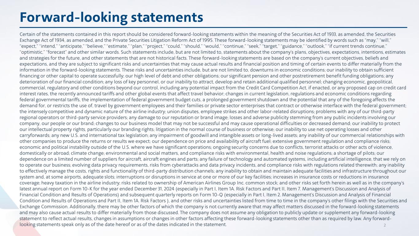 Certain of the statements contained in this report should be considered forward-looking statements within the meaning of the Securities Act of 1933, as amended, the Securities Exchange Act of 1934, as amended, and the Private Securities Litigation Reform Act of 1995. These forward-looking statements may be identified by words such as “may,” “will,” “expect,” “intend,” “anticipate,” “believe,” “estimate,” “plan,” “project,” “could,” “should,” “would,” “continue,” “seek,” “target,” “guidance,” “outlook,” “if current trends continue,” “optimistic,” “forecast” and other similar words. Such statements include, but are not limited to, statements about the company’s plans, objectives, expectations, intentions, estimates and strategies for the future, and other statements that are not historical facts. These forward-looking statements are based on the company’s current objectives, beliefs and expectations, and they are subject to significant risks and uncertainties that may cause actual results and financial position and timing of certain events to differ materially from the information in the forward-looking statements. These risks and uncertainties include, but are not limited to, downturns in economic conditions; our inability to obtain sufficient financing or other capital to operate successfully; our high level of debt and other obligations; our significant pension and other postretirement benefit funding obligations; any deterioration of our financial condition; any loss of key personnel, or our inability to attract, develop and retain additional qualified personnel; changing economic, geopolitical, commercial, regulatory and other conditions beyond our control, including any potential impact from the Credit Card Competition Act, if enacted, or any proposed cap on credit card interest rates, the recently announced tariffs and other global events that affect travel behavior; changes in current legislation, regulations and economic conditions regarding federal governmental tariffs, the implementation of federal government budget cuts, a prolonged government shutdown and the potential that any of the foregoing affects the demand for, or restricts the use of, travel by government employees and their families or private sector enterprises that contract or otherwise interface with the federal government; the intensely competitive and dynamic nature of the airline industry; union disputes, employee strikes and other labor-related disruptions; problems with any of our third-party regional operators or third-party service providers; any damage to our reputation or brand image; losses and adverse publicity stemming from any public incidents involving our company, our people or our brand; changes to our business model that may not be successful and may cause operational difficulties or decreased demand; our inability to protect our intellectual property rights, particularly our branding rights; litigation in the normal course of business or otherwise; our inability to use net operating losses and other carryforwards; any new U.S. and international tax legislation; any impairment of goodwill and intangible assets or long-lived assets; any inability of our commercial relationships with other companies to produce the returns or results we expect; our dependence on price and availability of aircraft fuel; extensive government regulation and compliance risks; economic and political instability outside of the U.S. where we have significant operations; ongoing security concerns due to conflicts, terrorist attacks or other acts of violence, domestically or abroad; climate change; environmental and social matters, and compliance risks with environmental, health and noise regulations; a shortage of pilots; our dependence on a limited number of suppliers for aircraft, aircraft engines and parts; any failure of technology and automated systems, including artificial intelligence, that we rely on to operate our business; evolving data privacy requirements, risks from cyberattacks and data privacy incidents, and compliance risks with regulations related therewith; any inability to effectively manage the costs, rights and functionality of third-party distribution channels; any inability to obtain and maintain adequate facilities and infrastructure throughout our system and, at some airports, adequate slots; interruptions or disruptions in service at one or more of our key facilities; increases in insurance costs or reductions in insurance coverage; heavy taxation in the airline industry; risks related to ownership of American Airlines Group Inc. common stock; and other risks set forth herein as well as in the company’s latest annual report on Form 10-K for the year ended December 31, 2024 (especially in Part I, Item 1A. Risk Factors and Part II, Item 7. Management’s Discussion and Analysis of Financial Condition and Results of Operations) and subsequent quarterly reports on Form 10-Q (especially in Part I, Item 2. Management’s Discussion and Analysis of Financial Condition and Results of Operations and Part II, Item 1A. Risk Factors ), and other risks and uncertainties listed from time to time in the company’s other filings with the Securities and Exchange Commission. Additionally, there may be other factors of which the company is not currently aware that may affect matters discussed in the forward-looking statements and may also cause actual results to differ materially from those discussed. The company does not assume any obligation to publicly update or supplement any forward-looking statement to reflect actual results, changes in assumptions or changes in other factors affecting these forward-looking statements other than as required by law. Any forward- looking statements speak only as of the date hereof or as of the dates indicated in the statement. Forward-looking statements 2