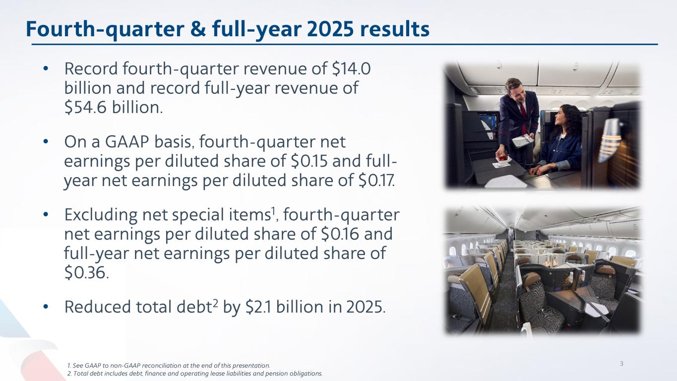 American delivered record fourth-quarter revenue of $14.0 billion, despite the $325 million negative impact from the government shutdown. Year-over-year passenger unit revenue performance improved sequentially versus the third quarter in each of the international entities. The majority of the impact from the government shutdown was felt in the domestic entity, where passenger unit revenue was down 2.5% year over year. Excluding the negative impact from the government shutdown, year-over-year domestic passenger unit revenue would have been positive for the quarter. Premium product offerings continued to perform exceptionally well, with year-over-year premium unit revenue outperforming the main cabin in the fourth quarter. Following softer-than-expected bookings late in the fourth quarter, bookings strengthened meaningfully in January. Systemwide revenue intakes for the first three weeks of 2026 are up double digits year over year, driven by strong performance in the premium cabins and corporate channels. Based on these bookings, the company expects solidly positive first-quarter unit revenue for the domestic entity and the system, with total revenue growing 7.0%-10.0%.
