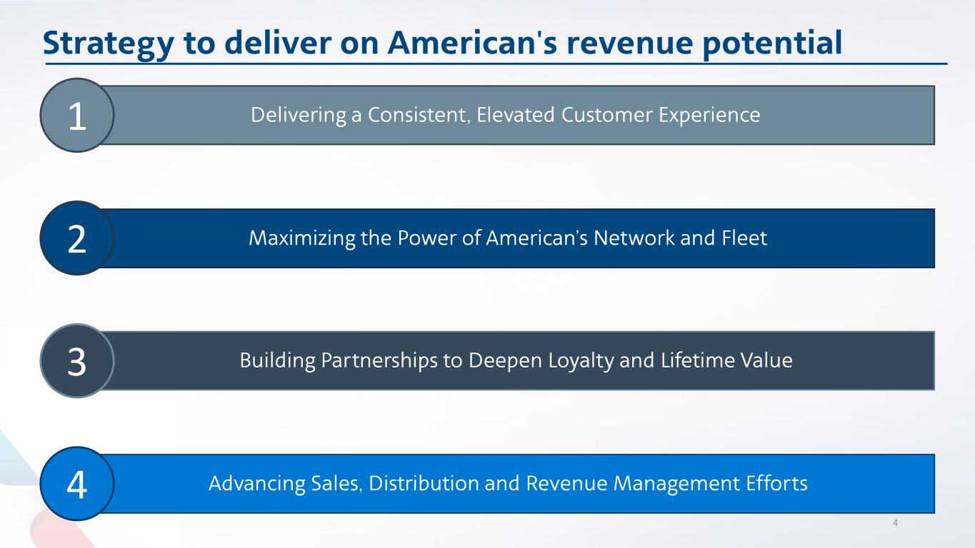 Strategy to deliver on American's revenue potential Delivering a Consistent, Elevated Customer Experience1 Maximizing the Power of American’s Network and Fleet2 Building Partnerships to Deepen Loyalty and Lifetime Value3 Advancing Sales, Distribution and Revenue Management Efforts4 4
