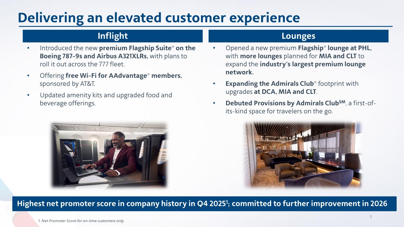 American is elevating every step of the travel journey for its customers. The Flagship Suite® product, introduced in June 2025, has set a new industry standard for luxury in long-haul travel and continues to lead in customer satisfaction since entering service. American offers the industry’s most extensive premium lounge network and continues to make significant investments in its Flagship® and Admirals Club® lounges.