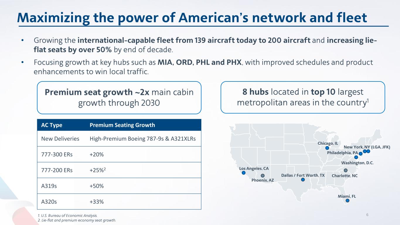 American operates the strongest network in the U.S. — the world’s most important aviation market — with eight hubs in the 10 largest metropolitan areas. This network, combined with the global reach of its partners, connects more people to more places than any other airline. Looking ahead, the company expects to continue to expand its partnerships, including its global joint business partners and the oneworld alliance.