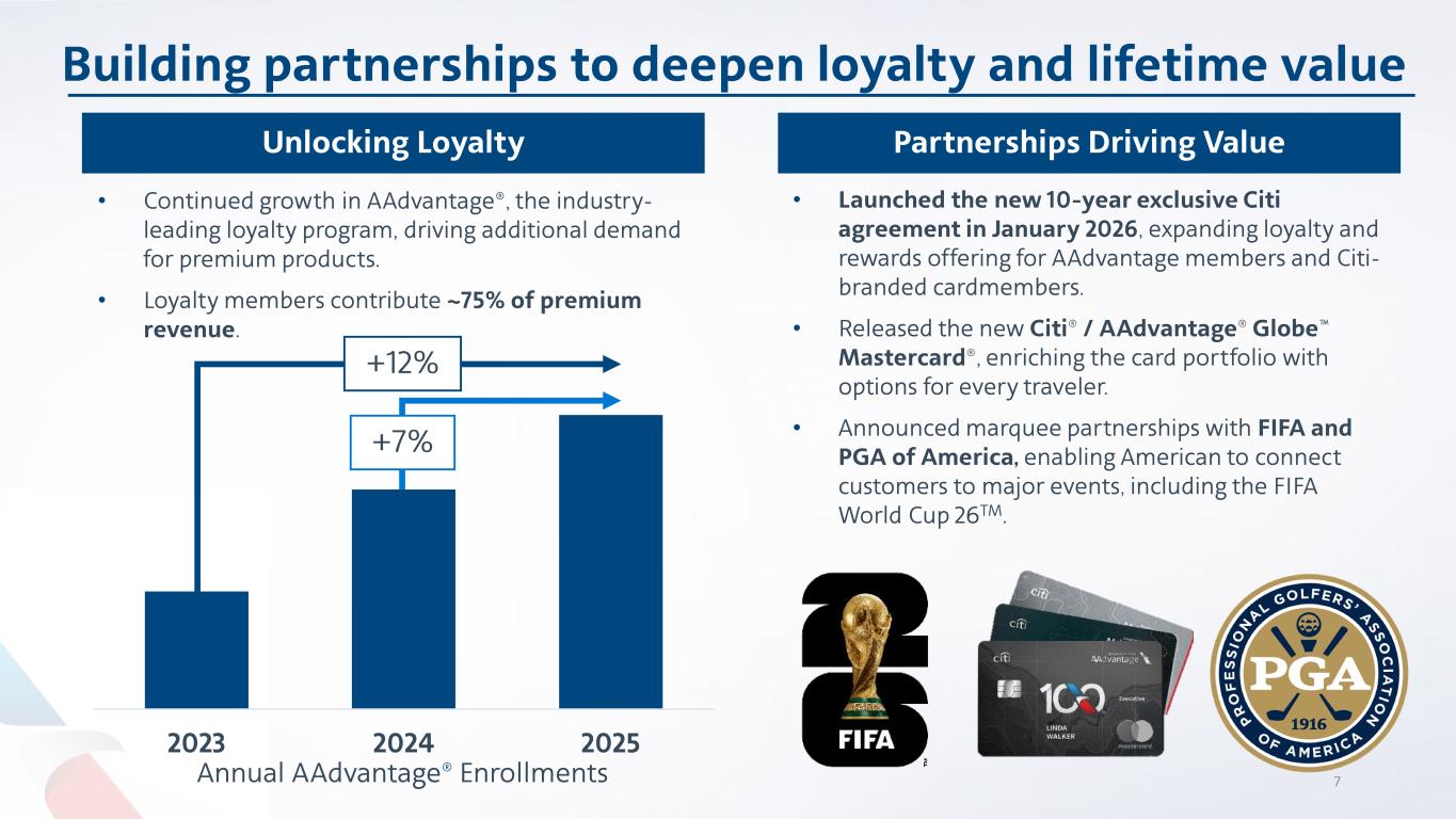 2023 2024 2025 Building partnerships to deepen loyalty and lifetime value • Continued growth in AAdvantage®, the industry- leading loyalty program, driving additional demand for premium products. • Loyalty members contribute ~75% of premium revenue. +7% +12% • Launched the new 10-year exclusive Citi agreement in January 2026, expanding loyalty and rewards offering for AAdvantage members and Citi- branded cardmembers. • Released the new Citi® / AAdvantage® Globe Mastercard®, enriching the card portfolio with options for every traveler. • Announced marquee partnerships with FIFA and PGA of America, enabling American to connect customers to major events, including the FIFA World Cup 26TM. Partnerships Driving ValueUnlocking Loyalty Annual AAdvantage® Enrollments 7