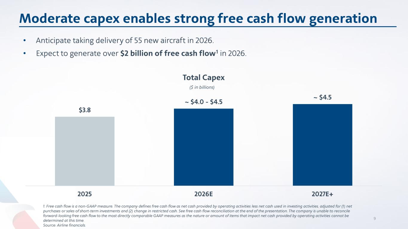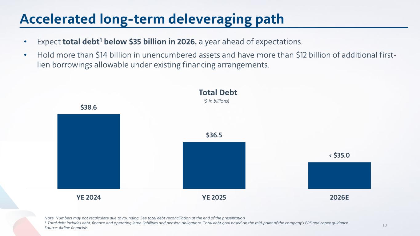 • Anticipate taking delivery of 55 new aircraft in 2026. • Expect to generate over $2 billion of free cash flow1 in 2026. Moderate capex enables strong free cash flow generation Total Capex ($ in billions) 1. Free cash flow is a non-GAAP measure. The company defines free cash flow as net cash provided by operating activities less net cash used in investing activities, adjusted for (1) net purchases or sales of short-term investments and (2) change in restricted cash. See free cash flow reconciliation at the end of the presentation. The company is unable to reconcile forward-looking free cash flow to the most directly comparable GAAP measures as the nature or amount of items that impact net cash provided by operating activities cannot be determined at this time. Source: Airline financials. $3.8 ~ $4.0 - $4.5 ~ $4.5 2025 2026E 2027E+ 9