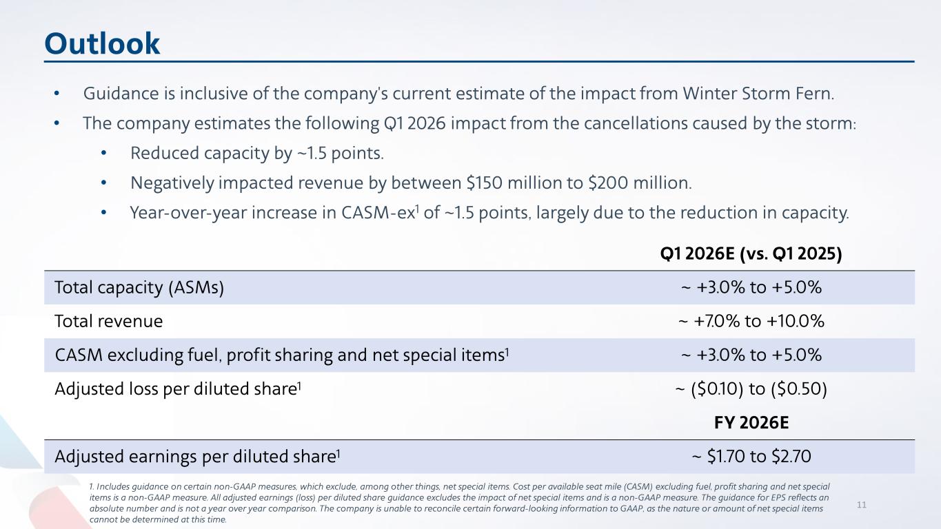 The guidance below reflects the company’s preliminary estimate of the impact from the ongoing Winter Storm Fern. The storm has resulted in more than 9,000 flight cancellations to date, making it the largest weather-related operational disruption in American’s history. As a result, the company’s first-quarter 2026 guidance incorporates approximately a 1.5-point reduction to capacity, an estimated negative revenue impact of $150-$200 million and approximately a 1.5-point increase in CASM-ex6 (largely due to the reduction in capacity).