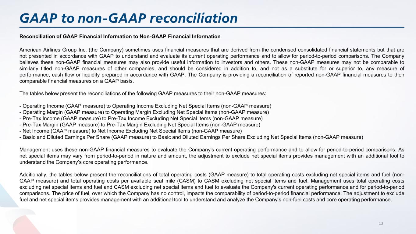 GAAP to non-GAAP reconciliation Reconciliation of GAAP Financial Information to Non-GAAP Financial Information American Airlines Group Inc. (the Company) sometimes uses financial measures that are derived from the condensed consolidated financial statements but that are not presented in accordance with GAAP to understand and evaluate its current operating performance and to allow for period-to-period comparisons. The Company believes these non-GAAP financial measures may also provide useful information to investors and others. These non-GAAP measures may not be comparable to similarly titled non-GAAP measures of other companies, and should be considered in addition to, and not as a substitute for or superior to, any measure of performance, cash flow or liquidity prepared in accordance with GAAP. The Company is providing a reconciliation of reported non-GAAP financial measures to their comparable financial measures on a GAAP basis. The tables below present the reconciliations of the following GAAP measures to their non-GAAP measures: - Operating Income (GAAP measure) to Operating Income Excluding Net Special Items (non-GAAP measure) - Operating Margin (GAAP measure) to Operating Margin Excluding Net Special Items (non-GAAP measure) - Pre-Tax Income (GAAP measure) to Pre-Tax Income Excluding Net Special Items (non-GAAP measure) - Pre-Tax Margin (GAAP measure) to Pre-Tax Margin Excluding Net Special Items (non-GAAP measure) - Net Income (GAAP measure) to Net Income Excluding Net Special Items (non-GAAP measure) - Basic and Diluted Earnings Per Share (GAAP measure) to Basic and Diluted Earnings Per Share Excluding Net Special Items (non-GAAP measure) Management uses these non-GAAP financial measures to evaluate the Company's current operating performance and to allow for period-to-period comparisons. As net special items may vary from period-to-period in nature and amount, the adjustment to exclude net special items provides management with an additional tool to understand the Company’s core operating performance. Additionally, the tables below present the reconciliations of total operating costs (GAAP measure) to total operating costs excluding net special items and fuel (non- GAAP measure) and total operating costs per available seat mile (CASM) to CASM excluding net special items and fuel. Management uses total operating costs excluding net special items and fuel and CASM excluding net special items and fuel to evaluate the Company's current operating performance and for period-to-period comparisons. The price of fuel, over which the Company has no control, impacts the comparability of period-to-period financial performance. The adjustment to exclude fuel and net special items provides management with an additional tool to understand and analyze the Company’s non-fuel costs and core operating performance. 13