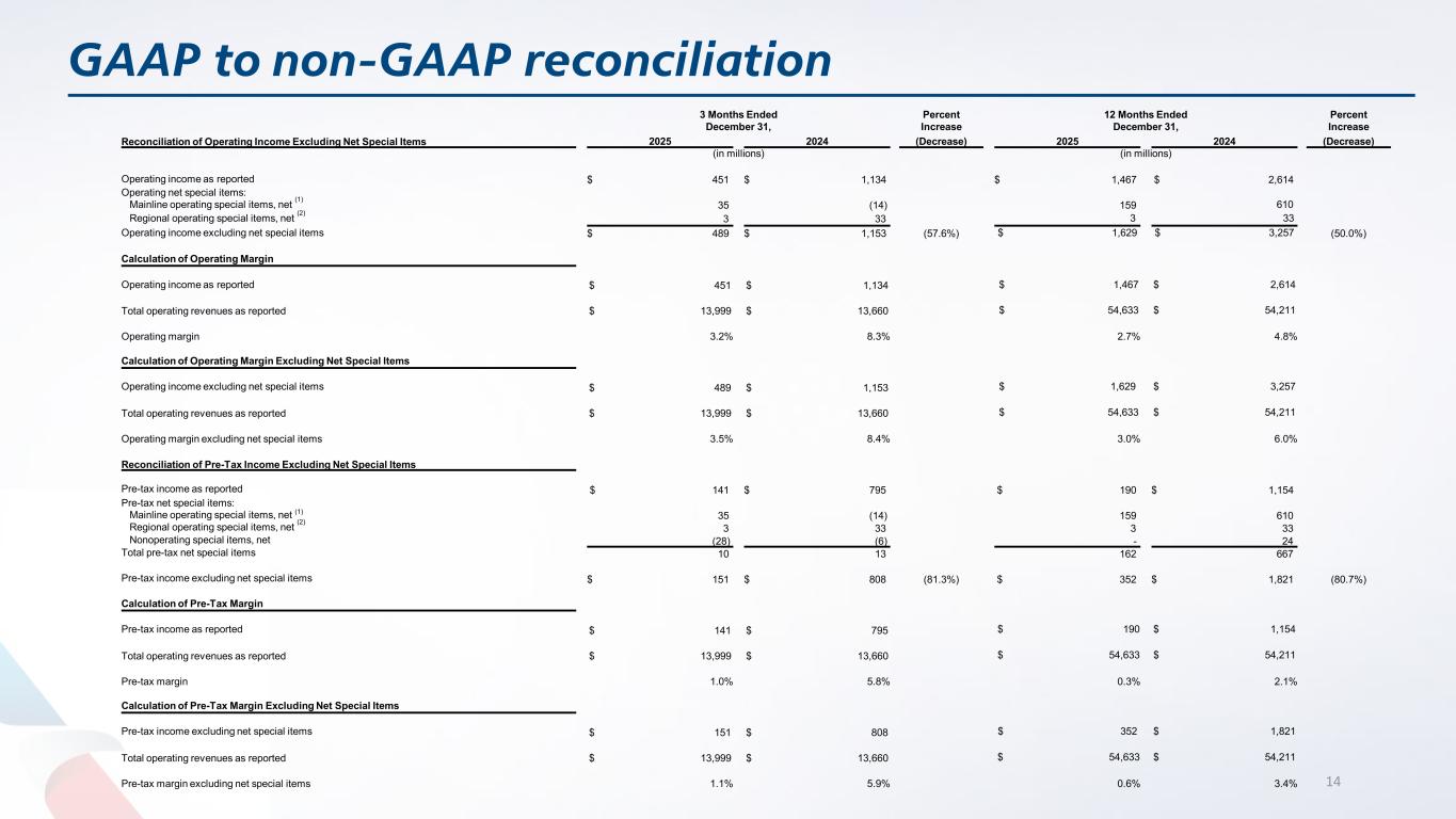 GAAP to non-GAAP reconciliation Reconciliation of Operating Income Excluding Net Special Items 3 Months Ended December 31, Percent Increase 12 Months Ended December 31, Percent Increase 2025 2024 (Decrease) 2025 2024 (Decrease) (in millions) (in millions) Operating income as reported $ 451 $ 1,134 $ 1,467 $ 2,614 Operating net special items: Mainline operating special items, net (1) 35 (14) 159 610 Regional operating special items, net (2) 3 33 3 33 Operating income excluding net special items $ 489 $ 1,153 (57.6%) $ 1,629 $ 3,257 (50.0%) Calculation of Operating Margin Operating income as reported $ 451 $ 1,134 $ 1,467 $ 2,614 Total operating revenues as reported $ 13,999 $ 13,660 $ 54,633 $ 54,211 Operating margin 3.2% 8.3% 2.7% 4.8% Calculation of Operating Margin Excluding Net Special Items Operating income excluding net special items $ 489 $ 1,153 $ 1,629 $ 3,257 Total operating revenues as reported $ 13,999 $ 13,660 $ 54,633 $ 54,211 Operating margin excluding net special items 3.5% 8.4% 3.0% 6.0% Reconciliation of Pre-Tax Income Excluding Net Special Items Pre-tax income as reported $ 141 $ 795 $ 190 $ 1,154 Pre-tax net special items: Mainline operating special items, net (1) 35 (14) 159 610 Regional operating special items, net (2) 3 33 3 33 Nonoperating special items, net (28) (6) - 24 Total pre-tax net special items 10 13 162 667 Pre-tax income excluding net special items $ 151 $ 808 (81.3%) $ 352 $ 1,821 (80.7%) Calculation of Pre-Tax Margin Pre-tax income as reported $ 141 $ 795 $ 190 $ 1,154 Total operating revenues as reported $ 13,999 $ 13,660 $ 54,633 $ 54,211 Pre-tax margin 1.0% 5.8% 0.3% 2.1% Calculation of Pre-Tax Margin Excluding Net Special Items Pre-tax income excluding net special items $ 151 $ 808 $ 352 $ 1,821 Total operating revenues as reported $ 13,999 $ 13,660 $ 54,633 $ 54,211 Pre-tax margin excluding net special items 1.1% 5.9% 0.6% 3.4% 14