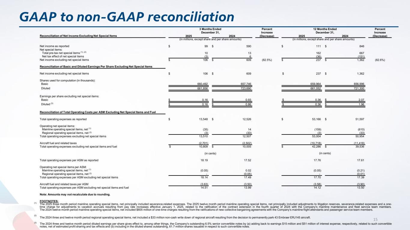 GAAP to non-GAAP reconciliation 3 Months Ended December 31, Percent Increase 12 Months Ended December 31, Percent Increase Reconciliation of Net Income Excluding Net Special Items 2025 2024 (Decrease) 2025 2024 (Decrease) (in millions, except share and per share amounts) (in millions, except share and per share amounts) Net income as reported $ 99 $ 590 $ 111 $ 846 Net special items: Total pre-tax net special items (1), (2) 10 13 162 667 Net tax effect of net special items (3) 6 (36) (151) Net income excluding net special items $ 106 $ 609 (82.5%) $ 237 $ 1,362 (82.6%) Reconciliation of Basic and Diluted Earnings Per Share Excluding Net Special Items Net income excluding net special items $ 106 $ 609 $ 237 $ 1,362 Shares used for computation (in thousands): Basic 660,492 657,746 659,964 656,996 Diluted 661,856 723,690 661,052 721,300 Earnings per share excluding net special items: Basic $ 0.16 $ 0.93 $ 0.36 $ 2.07 Diluted (3) $ 0.16 $ 0.86 $ 0.36 $ 1.96 Reconciliation of Total Operating Costs per ASM Excluding Net Special Items and Fuel Total operating expenses as reported $ 13,548 $ 12,526 $ 53,166 $ 51,597 Operating net special items: Mainline operating special items, net (1) (35) 14 (159) (610) Regional operating special items, net (2) (3) (33) (3) (33) Total operating expenses excluding net special items 13,510 12,507 53,004 50,954 Aircraft fuel and related taxes (2,701) (2,502) (10,718) (11,418) Total operating expenses excluding net special items and fuel $ 10,809 $ 10,005 $ 42,286 $ 39,536 (in cents) (in cents) Total operating expenses per ASM as reported 18.19 17.52 17.76 17.61 Operating net special items per ASM: Mainline operating special items, net (1) (0.05) 0.02 (0.05) (0.21) Regional operating special items, net (2) - (0.05) - (0.01) Total operating expenses per ASM excluding net special items 18.14 17.49 17.70 17.39 Aircraft fuel and related taxes per ASM (3.63) (3.50) (3.58) (3.90) Total operating expenses per ASM excluding net special items and fuel 14.51 13.99 14.12 13.50 Note: Amounts may not recalculate due to rounding. FOOTNOTES: (1) The 2025 three month period mainline operating special items, net principally included severance-related expenses. The 2025 twelve month period mainline operating special items, net principally included adjustments to litigation reserves, severance-related expenses and a one- time charge for adjustments to vacation accruals resulting from pay rate increases effective January 1, 2025, related to the ratification of the contract extension in the fourth quarter of 2024 with the Company's mainline maintenance and fleet service team members. The 2024 twelve month period mainline operating special items, net included $605 million of one-time charges resulting from the ratifications of new collective bargaining agreements with the Company's mainline flight attendants and passenger service team members. (2) The 2024 three and twelve month period regional operating special items, net included a $33 million non-cash write down of regional aircraft resulting from the decision to permanently park 43 Embraer ERJ145 aircraft. (3) The 2024 three and twelve month period diluted earnings per share gives effect to, among other things, the Company's outstanding 6.5% senior convertible notes by (a) adding back to earnings $15 million and $51 million of interest expense, respectively, related to such convertible notes, net of estimated profit sharing and tax effects and (b) including in the diluted shares outstanding, 61.7 million shares issuable in respect to such convertible notes. 15