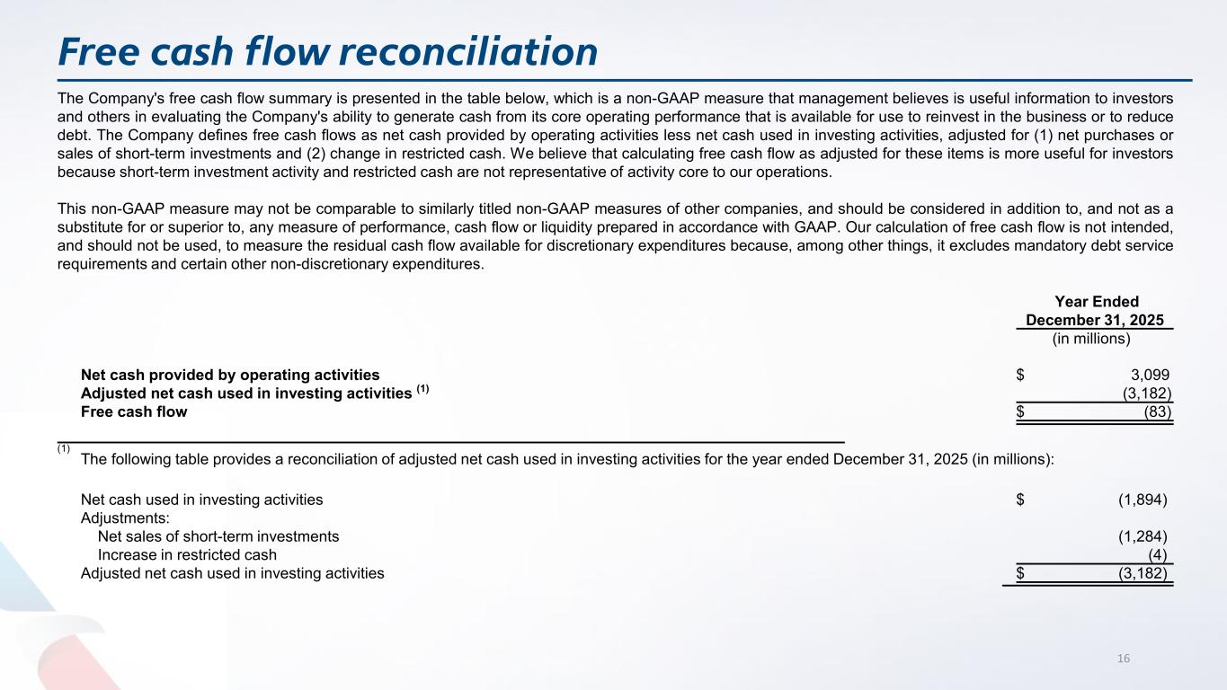 Free cash flow reconciliation The Company's free cash flow summary is presented in the table below, which is a non-GAAP measure that management believes is useful information to investors and others in evaluating the Company's ability to generate cash from its core operating performance that is available for use to reinvest in the business or to reduce debt. The Company defines free cash flows as net cash provided by operating activities less net cash used in investing activities, adjusted for (1) net purchases or sales of short-term investments and (2) change in restricted cash. We believe that calculating free cash flow as adjusted for these items is more useful for investors because short-term investment activity and restricted cash are not representative of activity core to our operations. This non-GAAP measure may not be comparable to similarly titled non-GAAP measures of other companies, and should be considered in addition to, and not as a substitute for or superior to, any measure of performance, cash flow or liquidity prepared in accordance with GAAP. Our calculation of free cash flow is not intended, and should not be used, to measure the residual cash flow available for discretionary expenditures because, among other things, it excludes mandatory debt service requirements and certain other non-discretionary expenditures. Year Ended December 31, 2025 (in millions) Net cash provided by operating activities $ 3,099 Adjusted net cash used in investing activities (1) (3,182) Free cash flow $ (83) (1) The following table provides a reconciliation of adjusted net cash used in investing activities for the year ended December 31, 2025 (in millions): Net cash used in investing activities $ (1,894) Adjustments: Net sales of short-term investments (1,284) Increase in restricted cash (4) Adjusted net cash used in investing activities $ (3,182) 16