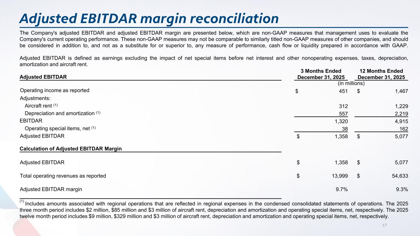 Adjusted EBITDAR margin reconciliation The Company's adjusted EBITDAR and adjusted EBITDAR margin are presented below, which are non-GAAP measures that management uses to evaluate the Company's current operating performance. These non-GAAP measures may not be comparable to similarly titled non-GAAP measures of other companies, and should be considered in addition to, and not as a substitute for or superior to, any measure of performance, cash flow or liquidity prepared in accordance with GAAP. Adjusted EBITDAR is defined as earnings excluding the impact of net special items before net interest and other nonoperating expenses, taxes, depreciation, amortization and aircraft rent. 3 Months Ended 12 Months Ended Adjusted EBITDAR December 31, 2025 December 31, 2025 (in millions) Operating income as reported $ 451 $ 1,467 Adjustments: Aircraft rent (1) 312 1,229 Depreciation and amortization (1) 557 2,219 EBITDAR 1,320 4,915 Operating special items, net (1) 38 162 Adjusted EBITDAR $ 1,358 $ 5,077 Calculation of Adjusted EBITDAR Margin Adjusted EBITDAR $ 1,358 $ 5,077 Total operating revenues as reported $ 13,999 $ 54,633 Adjusted EBITDAR margin 9.7% 9.3% (1) Includes amounts associated with regional operations that are reflected in regional expenses in the condensed consolidated statements of operations. The 2025 three month period includes $2 million, $85 million and $3 million of aircraft rent, depreciation and amortization and operating special items, net, respectively. The 2025 twelve month period includes $9 million, $329 million and $3 million of aircraft rent, depreciation and amortization and operating special items, net, respectively. 17
