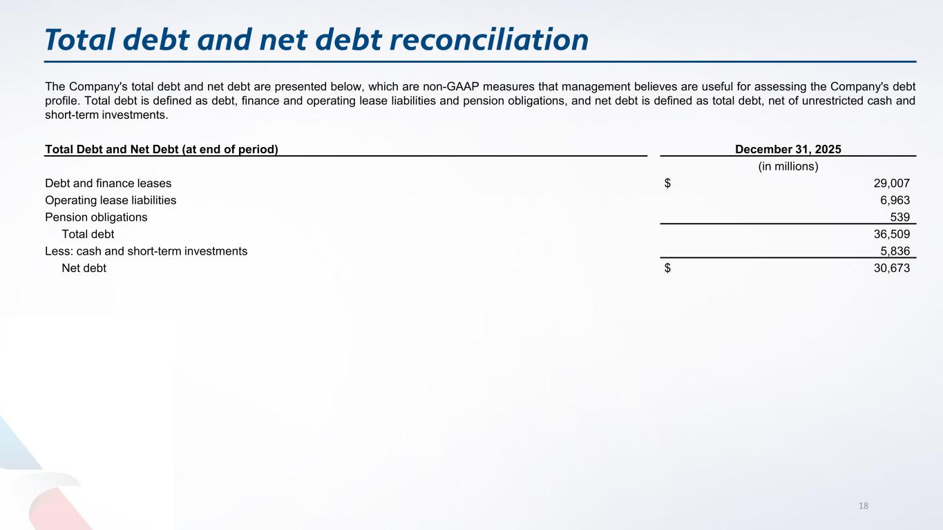 Total debt and net debt reconciliation The Company's total debt and net debt are presented below, which are non-GAAP measures that management believes are useful for assessing the Company's debt profile. Total debt is defined as debt, finance and operating lease liabilities and pension obligations, and net debt is defined as total debt, net of unrestricted cash and short-term investments. Total Debt and Net Debt (at end of period) December 31, 2025 (in millions) Debt and finance leases $ 29,007 Operating lease liabilities 6,963 Pension obligations 539 Total debt 36,509 Less: cash and short-term investments 5,836 Net debt $ 30,673 18